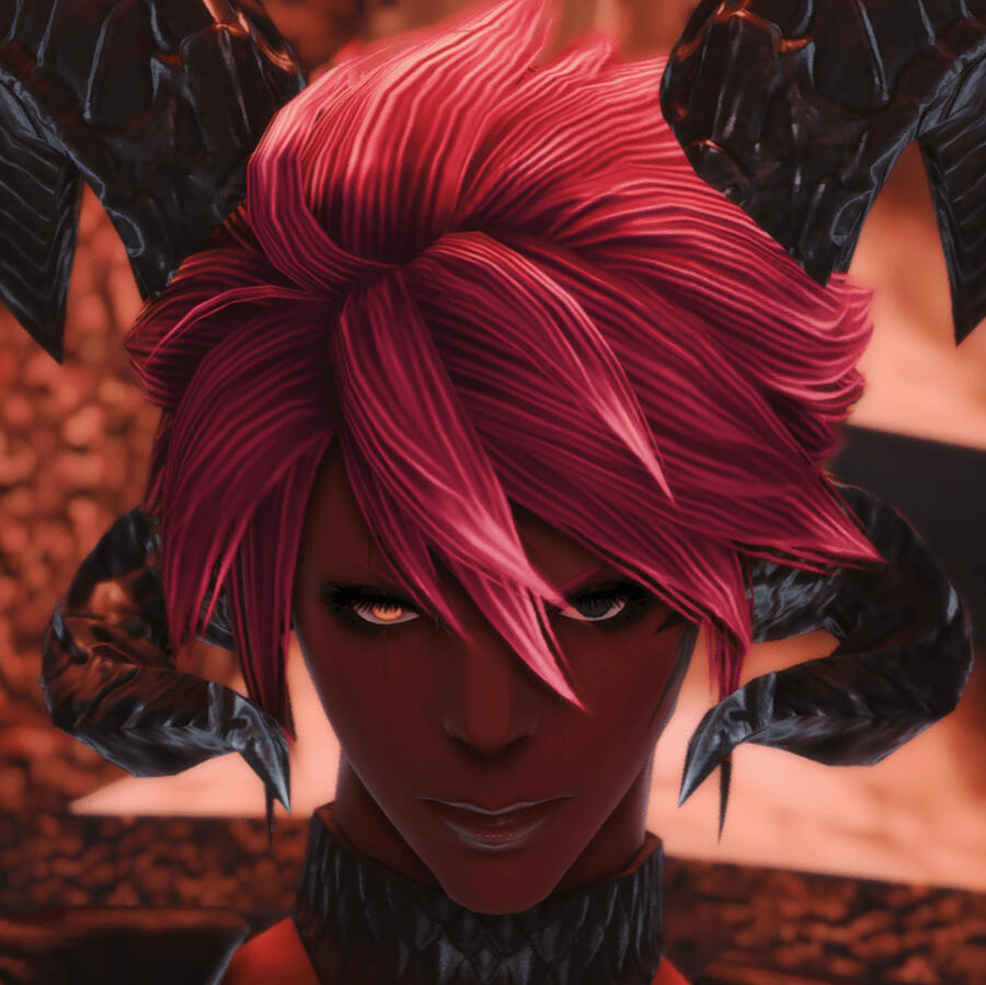 two onyx horns protrude through the darkened pink hair alongside two where her ears would be.